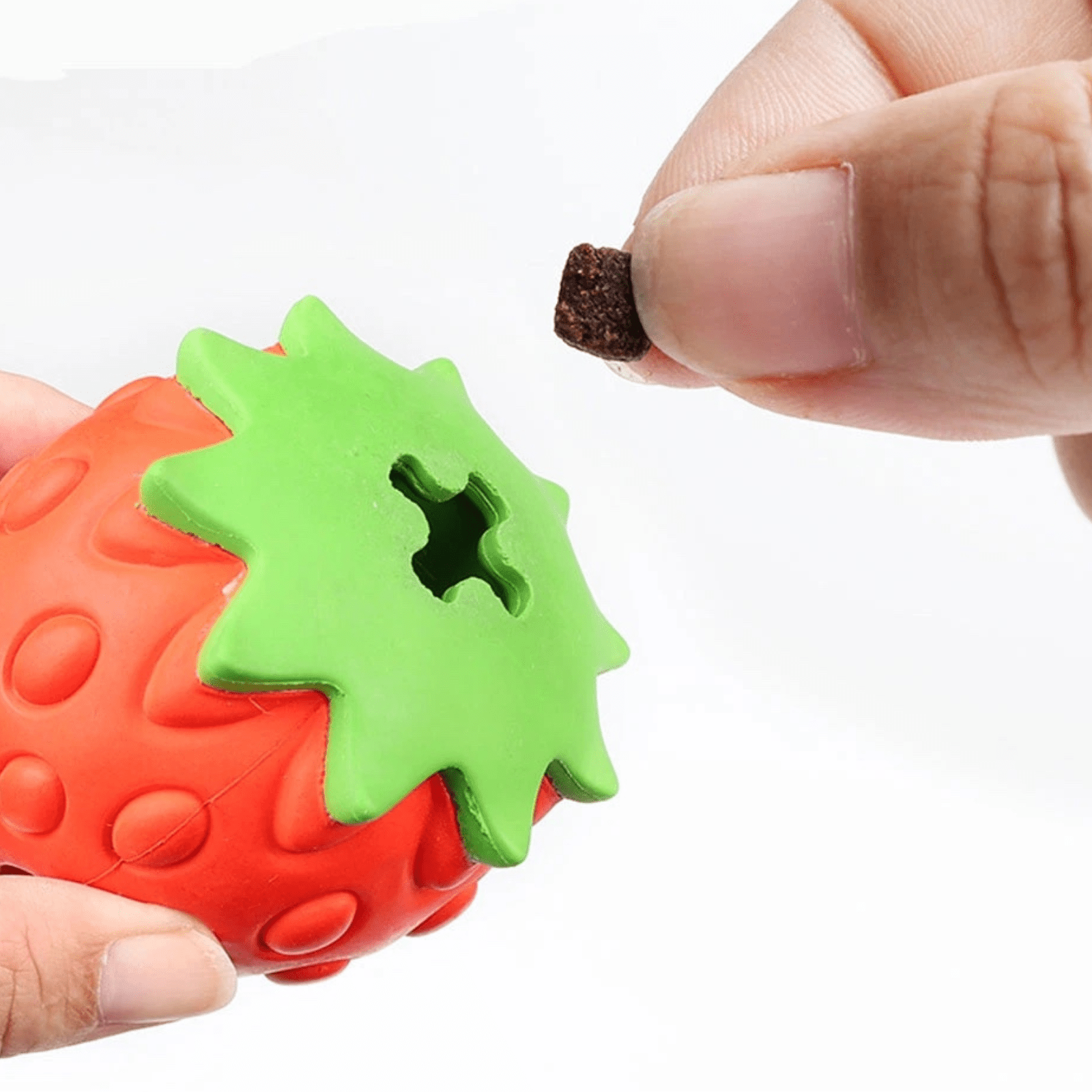 This multifunctional dog toy combines chewing, play, and treat dispensing to keep your dog mentally focused and physically active. The strawberry shape adds a fun look while the internal openings allow you to add small treats or kibble that release gradually as your dog plays.