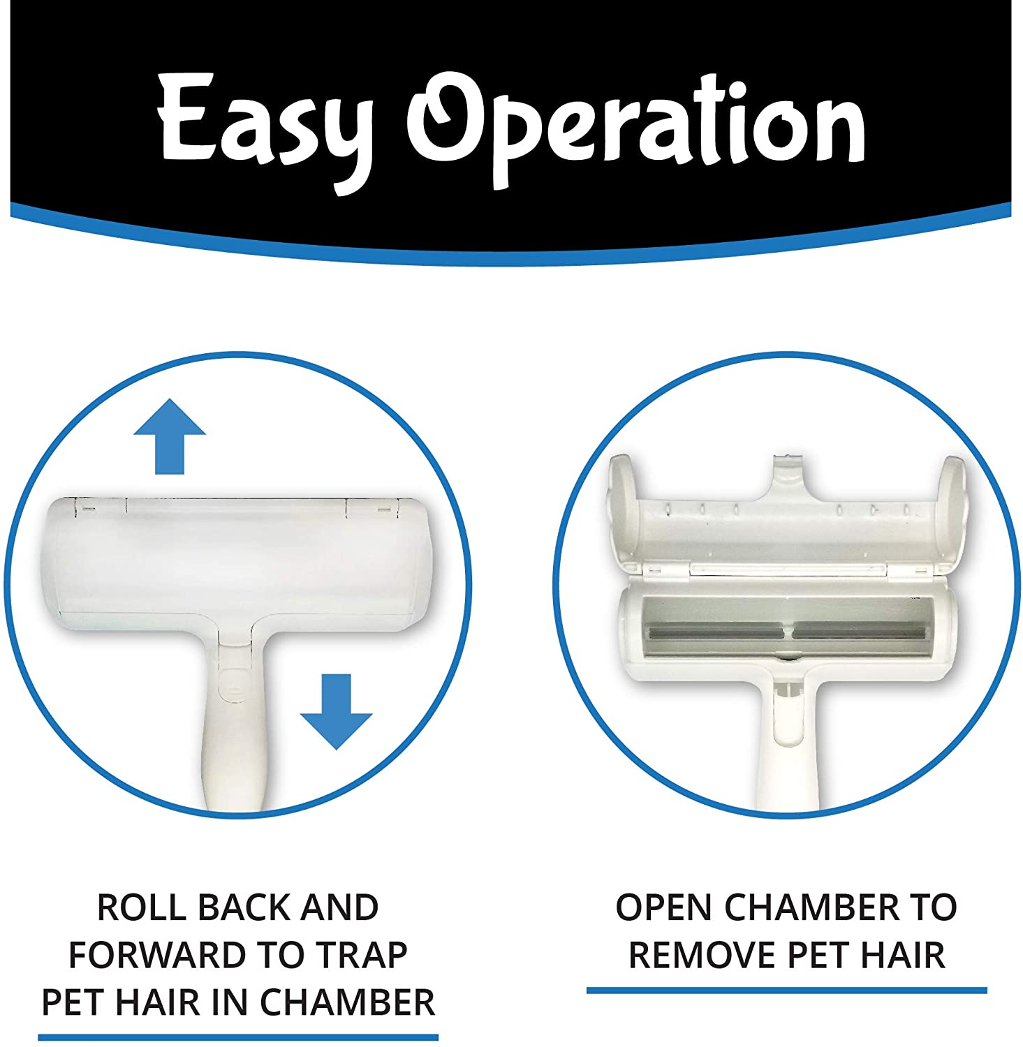 Powered entirely by manual back and forth rolling. The short, quick strokes collect loose hair, lint, and debris in seconds.